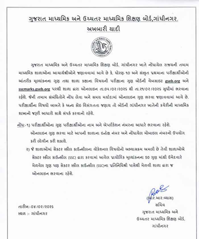 બોર્ડ દ્વારા જાહેર કરવામાં આવેલી સૂચના મુજબ, ધોરણ 10 અને સંસ્કૃત પ્રથમાના પરીક્ષાર્થીઓના ગુણ ભરવા માટે 5 ફેબ્રુઆરી 2026 થી 21 ફેબ્રુઆરી 2026 સુધીનો સમય આપવામાં આવ્યો છે. શાળાઓએ આ સમયગાળા દરમિયાન બોર્ડની સત્તાવાર વેબસાઈટ પરથી ઓનલાઈન ડેટા એન્ટ્રી કરવાની રહેશે. જો કોઈ શાળા આ સમયમર્યાદામાં ગુણ અપલોડ કરવામાં નિષ્ફળ જશે, તો તેમની સામે કડક કાર્યવાહી થઈ શકે છે.
