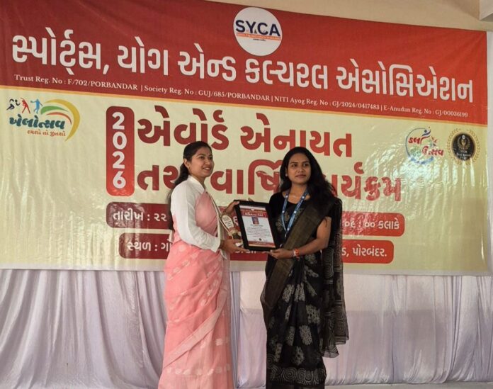 તાજેતરમાં પોરબંદર ખાતે Sports Yoga and Cultural Association દ્વારા આયોજિત ભવ્ય એવોર્ડ એનાયત સમારંભમાં કચ્છ જિલ્લાના રવાપર ગામની પ્રતિભાશાળી યુવતી ધારાબેન રવજીભાઈ બારમેડાને સમગ્ર ગુજરાતમાંથી પસંદગી પામી પ્રતિષ્ઠિત “સાહિત્ય રત્ન એવોર્ડ” એનાયત કરવામાં આવ્યો હતો.