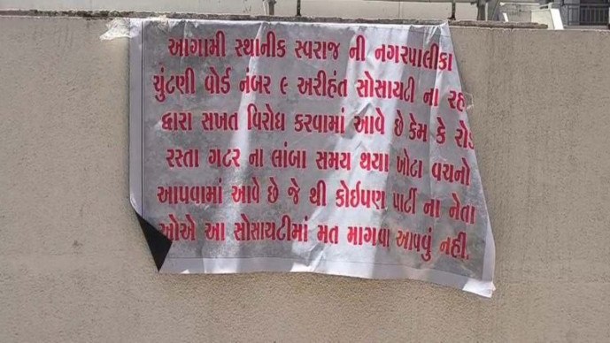 પરંતુ તે ખાતમહૂર્ત હતું કે પછી લોકોને મૂરખ બનાવવા માટેનો કાર્યક્રમ હતો તે આજની તારીખે લોકોને સમજાયું નથી જેથી પ્રાથમિક સુવિધાને લગતા તેઓના પ્રશ્નો ઉકેલવામાં આવ્યા ન હોવાના કારણે રોષે ભરાયેલા સોસાયટીના લોકો દ્વારા હાલમાં સોસાયટીના બંને બાજુના પ્રવેશ દ્વાર પાસે બોર્ડ બેનર લગાવીને કોઈપણ પાર્ટીના નેતાઓએ તેમના સોસાયટી વિસ્તારની અંદર મત માંગવા માટે ન આવવું તેવી સ્પષ્ટ વાત સાથે પોતાની વેદના ઠાલવી છે.