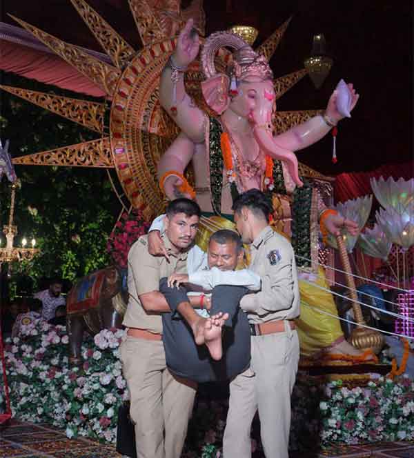 મોરબી : સિદ્ધિવિનાયક ગણેશ મહોત્સવમાં માનવતાને પ્રાથમિકતા આપતા મોરબી સીટી એ ડિવિઝન પોલીસ સ્ટેશન ખાતે ફરજ બજાવતા જી.આર.ડી. જવાન રવિરાજસિંહ જાડેજા (ખારચિયા) તથા યુવરાજસિંહ જાડેજા (મધુપુર) એ એક અપંગ ભક્તને પોતાની ખભે ઊંચકી પંડાલ સુધી પહોંચાડ્યો હતો.