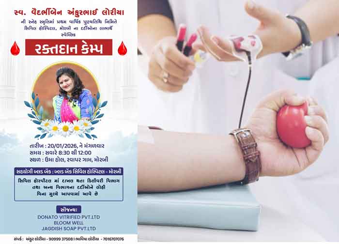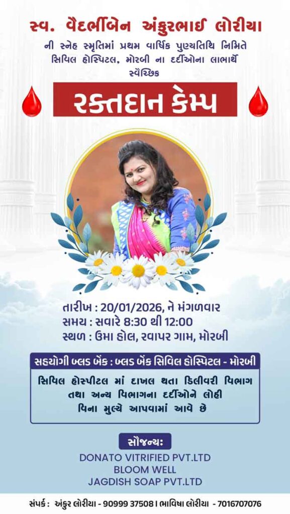 મોરબી : સ્વ. વૈદર્ભીબેન અંકુરભાઈ લોરિયાની સ્નેહભરી સ્મૃતિમાં તેમના પ્રથમ વાર્ષિક પુણ્યતિથિ નિમિતે મોરબીના સિવિલ હોસ્પિટલના દર્દીઓના લાભાર્થે રક્તદાન કેમ્પનું આયોજન કરવામાં આવ્યું છે.