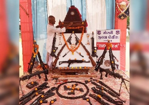અને તેઓએ શસ્ત્ર પૂજન કર્યું હતું અને ખાસ કરીને આ તકે એસપી દ્વારા મોરબી જિલ્લામાં શાંતિપૂર્ણ માહોલ જળવાઈ રહે તે માટે ભગવાનને પ્રાર્થના કરવામાં આવી હતી.