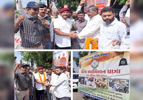 જો કે યાત્રાની સાથે મોરબી આવેલ એક સૈનિકની તબિયત લથડતા તેને સારવાર માટે હોસ્પિટલે લઈ ગયા હતા. સૈનિક સ્વાભિમાન યાત્રા આજે મોરબીના આંગણે પહોંચી હતી ત્યારે મોરબીના શનાળા રોડ ઉપર આવેલ ઉમિયા સર્કલ પાસે મોરબી જિલ્લા કોંગ્રેસના પ્રમુખ કિશોરભાઈ ચીખલીયા, શહેર કોંગ્રેસના પ્રમુખ પુષ્પરાજસિંહ જાડેજા સહિતના કોંગ્રેસના આગેવાનોની હાજરીમાં સૈનિક સ્વાભિમાન યાત્રાનું સ્વાગત અને સૈનિકોનું સન્માન કરવામાં આવ્યું હતું.