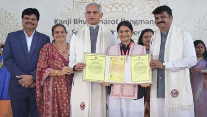એવા ડો.હિતાર્થી વડસોલાને સૌરાષ્ટ્ર યુનિવર્સિટીમાં ગોલ્ડ મેડલ તરીકે પસંદગી થતા સૌરાષ્ટ્ર યુનિવર્સિટીના કાનજી ભૂટા બારોટ ક્ધવેન્શન હોલમાં ચાર હજારથી વધુ ડોકટર તેમજ અન્ય વિદ્યા શાખાના તેજસ્વી તારલાની હાજરીમાં રાજ્યપાલ દેવવ્રત તેમજ શિક્ષણ મંત્રી ડો.પ્રદ્યુમન વાજાએ ડો.હિતાર્થી વડસોલાનું ગોલ્ડમેડલ અર્પણ અદકેરું સન્માન કર્યું હતું,આમ મોરબીની દિકરી ગોલ્ડ મેડાલિસ્ટ બનતાં મોરબીનું ગૌરવ વધાર્યું હોય ચોતરફથી અભિનંદનની વર્ષા થઈ રહી છે.